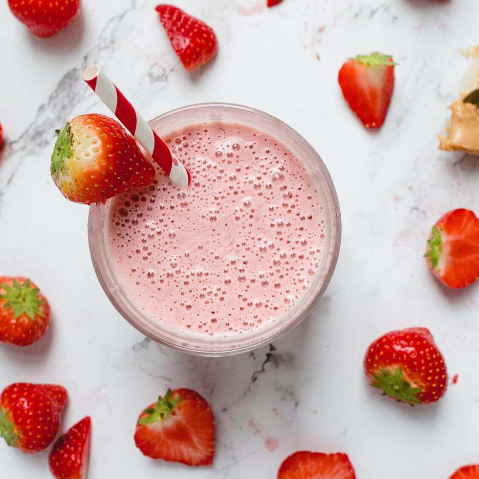 1. Place all the ingredients in a blender. Blend until smooth. If using fresh strawberries, add some ice to make the smoothie nice and cold.