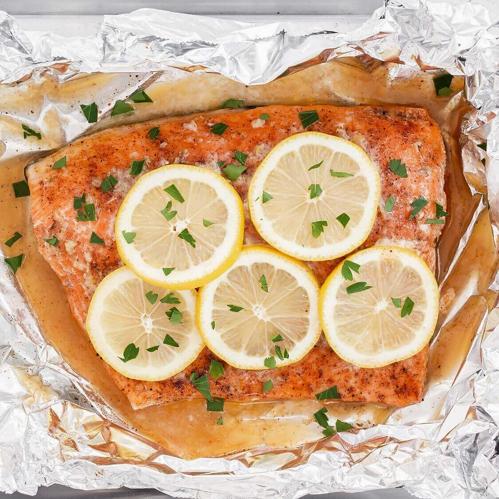 4. Pour the lemon garlic butter mixture over the salmon. If you have time, let sit for 15 minutes for the sauce to flavor the salmon more intensely. Carefully close the foil around the salmon, creating a pouch for the salmon to cook.