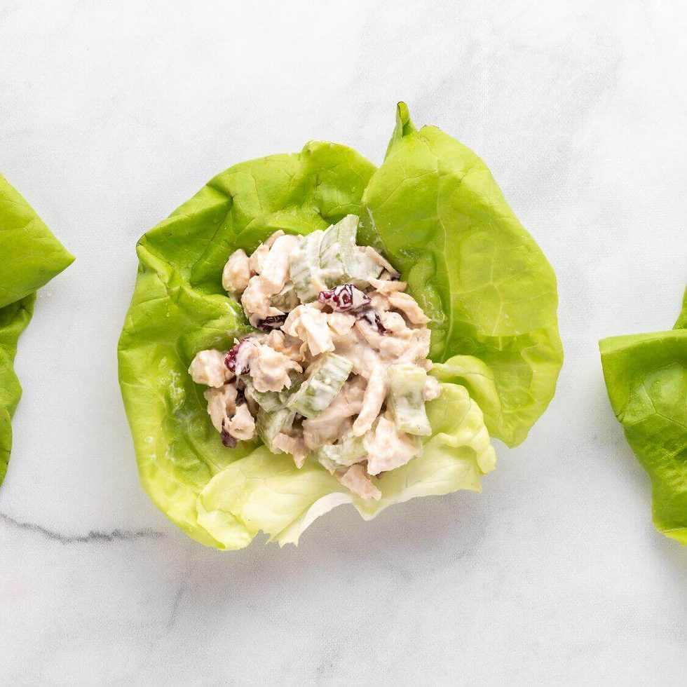 These lightened-up chicken salad lettuce wraps hit the sweet, savory, and crunchy notes all at once. Made with shredded chicken, dried cranberries, celery, and a dijon dressing, they work just as well as a meal prep lunch as a quick snack. Pack the lettuce separately if making ahead.